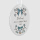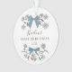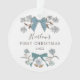 Mignons ornement de Noël pour un nouveau-né avec illustration dessinée à la main des arcs et des fleurs bleus. Le texte dit "XX's" PREMIER NOËL.