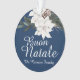 Cet ornement de vacances propose un thème de Noël italien avec des fleurs d'aquarelle sur un arrière - plan bleu marine. L'expression Buon Natale, qui se traduit par "Joyeux Noël" en Italie, est imprimée dans une police de texte élégante sur la partie inférieure. Un bouquet floral d'hiver de poinsettias blanches, branches de pin, cône de pin et feuillage d'hiver est représenté au-dessus de l'accueil natale du bouillon. Un exemple de nom de famille est imprimé en bas, que vous pouvez personnaliser pour inclure votre propre nom personnalisé ou un autre texte.