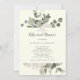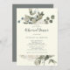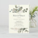 Cette invitation à dîner fleurie d'hiver sur l'ivoire est parfaite pour un événement élégant. Le design simple présente des fleurs blanches, de la verdure hivernale et des feuilles d'eucalyptus, dans un style champêtre moderne.