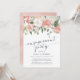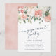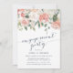 Élégante et moderne invitation à la fête florale présente un bouquet de roses pastel pastel, des pivoines et des hydrangées dans les tons rose roux, pêche et crème, avec feuilles botaniques verdoyants et eucalyptus. Personnalisez avec les détails de votre fiançailles en lettres bleues fumées et élégantes, accentuées par la calligraphie manuscrite.