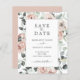 Elégant mariage à budget floral Enregistrer la Date avec un cadre composé de roses aquarellés en rose rose poussiéreux et vert dans les tons de vert sauge. Cette belle botanique sur le thème non photo Save the Date fait partie d'une collection qui est idéale pour un mariage de printemps ou d'été.