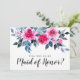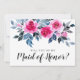 Elégant Will You Be My Maid Of Honor design de carte avec roses d'aquarelle rose vif, feuillage bleu et gris sur un arrière - plan blanc.