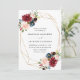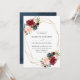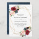 Un élégant faire-part de mariage floral présente vos détails mariages entourés d'un cadre en feuille d'or imitant avec des bouquets de fleurs d'aquarelle bleu marine, bordeaux et rose vif et des feuilles vertes luxuriantes. L'envers des invitations comporte un arrière - plan bleu marine en option.