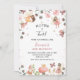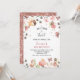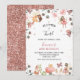 Une invitation à la fête d'anniversaire sur le thème de la fée de la douce fille avec trois fées, un gnome, un champignon et diverses fleurs. L'arrière de cette invitation est une image de parties scintillant couleur or rose foncé ou prune. Idéal pour une petite fille ayant une fête d'anniversaire à thème fée.