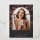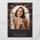 Élégant faire-part de graduation photo dispose d'une photo verticale ou portrait orientée dans une disposition unique voûtée, sur un arrière - plan noir de charbon avec feuille d'or rose à garniture florale et botanique. "Graduate" apparaît ci-dessous, ainsi que le nom de votre diplômé et l'école ou le collège. Ajoutez un message personnel à l'arrière, ainsi qu'une photo supplémentaire.