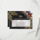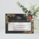 This RSVP card features a lovely floral spray on black embellished with gold leaves corners. The front has details for the recipient to fill out and the back has the young lady's name with a tiara. Designed to coordinate with the "Floral & Gold Leaves - Black & Pearl" Quinceanera Collection. To change details, click «Personalize». To move the text or change the text size, font, or color click «Click to customize further»