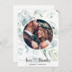Cette carte postale de remerciement de mariage élégant a une photo en face avec des feuilles eucalyptus, l'amour et Merci superposition texte et les noms du couple. Le côté arrière a votre propre message personnel, et une autre photo.
