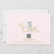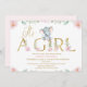 Sweet and elegant girl's elephant themed baby shower invitation featuring some pink peonies floral arrangements and some foliage, a faux gold word and cute elephant illustration. A QR code is on the back.