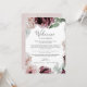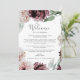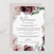 Ces cartes d'accueil et d'itinéraires mariages de romance florale sont parfaites pour un mariage élégant. Le design boho rustique moderne présente des fleurs d'aquarelle romantiques dans des tons doux de bordeaux, mauve, rose rousse et blanc crème avec des feuilles verts. Le recto de la carte comporte une lettre de bienvenue et le verso de la carte indique l'itinéraire du mariage. Ces notes sont parfaites pour les mariages de destination et les sacs de bienvenue des clients de l'hôtel.