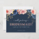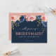 Demandez à votre soeur, à votre bestie, à votre neice, à votre fille ou à votre ami d'être une demoiselle d'honneur à votre mariage avec cette carte de proposition de bonne d'honneur magnifique. Doté d'un arrière - plan bleu marine branché aux flancs rose vif et bleu minuit aux faux feuillages dorés. Tout le texte est facilement customisé en utilisant le modèle fourni.