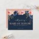Demandez à votre soeur, à votre bestie, à votre neice, à votre fille ou à votre ami d'être une bonne d'honneur à votre mariage avec cette magnifique carte de proposition de demoiselle d'honneur. Doté d'un arrière - plan bleu marine branché aux flancs rose vif et bleu minuit aux faux feuillages dorés. Tout le texte est facilement customisé en utilisant le modèle fourni.