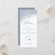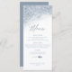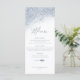 Une police de signature manuscrite associée à des cadres géométriques, des arrière - plans brillants et des fleurs luxuriantes sont utilisés dans cette collection pour donner un ton chaleureux et intime à votre mariage. Le menu mariage présenté ici, avec son arrière - plan pétillant en bleu poussiéreux sur blanc, est un élégant arrière - plan pour ajouter vos propres sélections de menu, noms et date de mariage. Recherchez ID889 pour voir tous les produits de ce jeu de mariages.