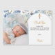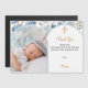 Un Carte de remerciements magnétique. Ajoutez une photo de taille verticale. Un cadre photo en arc bleu bébé. Couleur arrière - plan blanche, décorée de cadrans bleus, de fleurs. Personnalisez et ajoutez un nom et des détails.