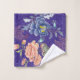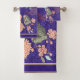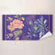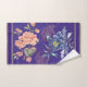 Un bel étalage de fleurs en rose et blues adossées à un riche support en brocart violet avec une garniture à bande d'or. Un ajout élégant à votre bain design.