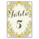 Cette carte de numéro de table à fleurs rustique et chic de campagne présente de belles fleurs d'aquarelle en fleurs, des boutons de fleurs, des feuilles et des feuilles dans de jolies nuances de rose, de jaune et de vert. Le numéro de table est écrit dans un joli script de calligraphie et encadré par la couronne florale.