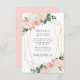Cartes élégantes et élégantes pour l'enceinte de mariage avec vos détails mariages entourées d'un cadre géométrique en faux or orné de bouquets de roses d'aquarelle rose vif et tulipes aux feuilles verts luxuriants et en cuivre. Personnalisez la carte en ajoutant des informations importantes telles que l'hébergement à l'hôtel, le site Web du mariage, les itinéraires, etc.