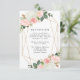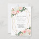 Cartes élégantes et élégantes pour l'enceinte de mariage avec détails de réception de mariage entourées d'un cadre géométrique en faux or orné de bouquets de roses d'aquarelle rose vif et tulipes avec feuilles vert et cuivre luxuriants. Personnalisez la carte en ajoutant des informations importantes telles que l'emplacement de la réception, les heures, etc.