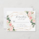 Cartes RSVP florales élégantes et élégantes, avec vos détails mariages, entourées d'une bordure géométrique en faux feuille d'or ornée de fleurs d'aquarelle rose et blanche et de feuilles verts luxuriants. Les cartes de réponse mariages chic sont parfaites pour les mariages du printemps et de l'été et ont été conçues pour s'harmoniser avec notre collection de mariages floraux Blush Spring.
