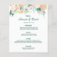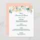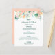 Une carte de menu mariage, élégante et romantique. Roses aquarellés, fleurs en blanc, rose vif, orange avec feuillage vert. Modèle pour vos noms, date et menu mariage. Arrière - plan blanc à l'avant, couleur cuivre à l'arrière. Lettres vertes.