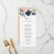 Cette carte de dîner aux fleurs rousses et marines blanche mariage est parfaite pour un mariage à fleurs. Le design classique et élégant présente une aquarelle moderne bleu marine et des fleurs roses rousses. Ce menu peut être utilisé pour une réception de mariage, un dîner de répétition ou tout événement.
