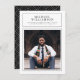 Cette carte faire-part, "Focus", comporte deux cadres rectangulaires. Le cadre supérieur est un affichage du nom du diplômé, alma mater, spécialisation ou étape suivante, et année de classe. Le cadre inférieur présente votre photo préférée du gris. Ces cartes s'inversent à un motif géométrique élégant. Un thème formel et professionnel. Utilisez ce modèle pour concevoir vos propres annonces de diplômes de classe supérieure ou d'université. Il suffit d'ajuster le libellé et de modifier la photo dans l'insertion d'image. Consultez nos collections pour plus d'idées de graduation. N'hésitez pas à m'envoyer un message pour toute question de design (avant de commander), je serai heureux de vous aider. Félicitations au diplômé !