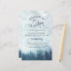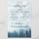 Ces programmes de mariage sont élégants et de bon goût, tout en étant toujours à l'aise avec le budget. L'aménagement comprend une scène montagneuse avec des pins bleus, entourés de brume ou de brouillard. La typographie présente une calligraphie de script dentée, et il y a de la place pour des détails sur la cérémonie, la fête de la mariée, et un bref merci.