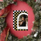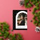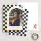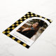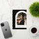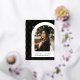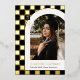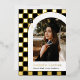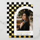 Cette faire-part moderne et unique de graduation présente une véritable feuille d'or et un arrière - plan à damiers noir qui met en évidence une photographie du diplômé encadrée dans une arche blanche avec le nom du diplômé et l'école en dessous. Un petit casquette de gradation est astucieusement affiché dans l'arrière - plan vérifié avec l'année de graduation du diplômé. Le dos a un motif assorti en blanc et noir.