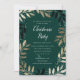 Une élégante invitation à la fête de Noël avec des branches de pin à faux feuille dessinées à la main dans une palette de couleur vert et or festif dessinée par Stacey Meacham.