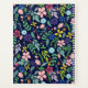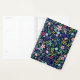 Floral avec feuillage flottant, jolies fleurs stylisées, feuilles, baies, glands et pois d'accent dans les tons vert, bleu, rose, violet et jaune avec des accents d'orange, rouge et marron. Placé sur le bleu express foncé de minuit. L'image est placée des deux côtés du produit. Utilisez les modèles pour personnaliser avec votre nom ou message en police rose pâle sur une plaque d'identification bleu foncé encadrée en rose.