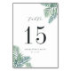 Les cartes de numéro de table chic de l'île sont équipées de feuilles de fronde de palmier d'aquarelle tropicale aux coins, encadrant votre numéro de table en noir élégant. Personnalisez avec vos noms et votre date de mariage, ou nommez chaque table pour une touche personnelle supplémentaire. Le design se répète à l'envers. Coordonnée avec notre suite de faire-part de mariage de Foliage Tropical.
