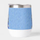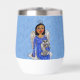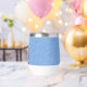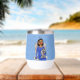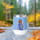 Ce cagoule à boisson a un ange brun aux yeux bleus assis sur un nuage blanc tenant un chat blanc d'ange portant une robe bleue sur un arrière - plan bleu ciel.