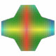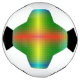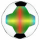 Un ballon de soccer présente un motif géométrique coloré, mélangeant le rouge, le jaune et le vert avec un effet de dégradé. Ci-dessous, le même motif est présenté à plat.