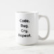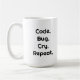 Perfect for programmers and engineers ☕ this sleek white mug features "Code. Bug. Cry. Repeat." in bold black text ✨ Simple, modern, and relatable, a design that inspires every coding or engineering session 🎁 Ideal gift for anyone who loves programming, debugging, or all things tech 🖤 Durable ceramic mug, perfect for coffee, tea, or any favorite drink 💡 A witty and thoughtful gift for developers, engineers, and tech lovers alike.