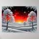 Apportez la beauté puissante de la nature dans votre espace avec cette œuvre d'art Forêt hivernale enneigée sous un coucher de soleil rouge, capturant un contraste saisissant entre l'hiver froid et le ciel chaud et lumineux. ❄️🌅