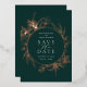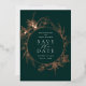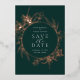 Un élégant design de sauvegarde de la date avec vos détails mariages en lettrage blanc cassé chic, encerclé par une bordure florale de feuilles d'or roses et feuillage sur un arrière - plan vert de forêt profonde.