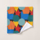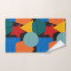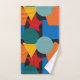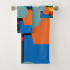 Ce kit de serviettes a une conception Bauhaus de formes aléatoires en bleu, turquoise, jaune, rouge et orange.