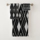 Ce kit de serviettes est décoré dans un style art déco avec des formes en losange gris sur un champ de noir.