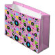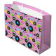 Ce sac cadeau présente des formes géométriques aux couleurs vives et vives sur un arrière - plan rose. Il est disponible en 4 tailles différentes et a une ambiance rétro que nous adorons !