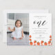 Illustrations mignonnes fraises, invitation photo 1er anniversaire. Caractéristiques de la carte, bordure de fraises illustrées en rouge, joli script graphique "un" et coordination du support de motif à bandes noir et blanc.