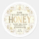 Un design floral circulaire vintage avec abeille de miel et cadre pointillé avec "HONEY" écrit en gros titre dans un dégradé d'or métallique. Arrière - plan blanc et ivoire pâle.