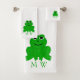 Bath towel set, consisting of a face cloth, hand towel and bath towel with an frog design. You can customise this bath towel set with any text of your choice. Should you require any help with customising then contact us through the message link on this page. Frog design bathroom towel set