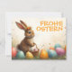 Ein niedlicher Osterhase mit einer Blumenkrone sitzt liebevoll inmitten bunter Ostéréier. Dans seinen Pfoten hält er ein kleines Weidenkörbchen mit bemalten Eiern. Die Szene ist von zarten Frühlingsblumen und réchauffem Licht umgeben. Über dem Hasen leuchtet in fröhlichem Orange die Aufschrift "Frohe Ostern"- ein herzlicher Gruß, der die Leichtigkeit und Freude des Frühlingsfestes einfängt.