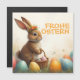 Ein niedlicher Osterhase mit einer Blumenkrone sitzt liebevoll inmitten bunter Ostéréier. Dans seinen Pfoten hält er ein kleines Weidenkörbchen mit bemalten Eiern. Die Szene ist von zarten Frühlingsblumen und réchauffem Licht umgeben. Über dem Hasen leuchtet in fröhlichem Orange die Aufschrift "Frohe Ostern"- ein herzlicher Gruß, der die Leichtigkeit und Freude des Frühlingsfestes einfängt.