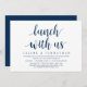 Moderne script dans un thème bleu marine élégant, carte d'invitation de mariage en fuite (Déjeuner avec nous, les jeunes mariés). C'est parfait pour votre célébration décontractée de mariage au bord du lac.