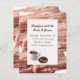 Invitation au petit-déjeuner mariage à base de lunettes de bacon cru, en arrière - plan. Les graphiques d'une zone de texte blanc, au centre, sont décorés d'une tasse de café et d'un beignet de chocolat. Le texte en marron foncé est prêt à être personnalisé pour votre petit déjeuner mariage. C'est un enclos avec vos invitations de mariage.