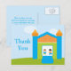 La carte postale de remerciement pour la fête d'anniversaire de ce garçon a un pavillon bleu, vert et orange sur la droite avec votre message de remerciement facilement personnalisable sur le dos. Il y a deux garçons qui rebondissent à l'intérieur de la maison. Cocoa Studio