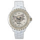 Des filles d'art de chat graphique marron crème regardent. Personnalisez cette montre avec votre nom actuellement lit Maya. Face de chatte mignonne par Sarah Trett.