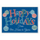 Carte Happy Holidays amusante, textuelle "From Our Home to Yours", avec ornements et lettres, remplie de chevrons et de pois rouges, bleus et verts, encadrée en blanc sur un arrière - plan bleu vif. Il y a aussi une carte frontale personnalisée avec ce design en coque que vous ne pouvez pas trouver de carte pour le destinataire spécifique que vous cherchez.