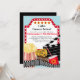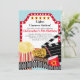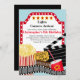 Commencez votre soirée d'anniversaire avec notre mignonne invitation de fête d'anniversaire de soirée cinéma avec une caméra noire avec pop-corn, un soda et des billets de cinéma sur un arrière - plan bleu clair avec étoiles Le dos de l'invitation est décoré d'une couleur noire. Entièrement personnalisable par vous avec vos informations. ©Babystar Designs