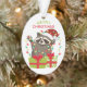 C'est un joli ornement de Noël pour les parents ou grands-parents à donner à un enfant, mais il peut être facilement customisé comme un cadeau pour n'importe qui. Le devant de l'ornement a l'image d'un drôle de raton laveur de dessins animés portant un chapeau de Père Noël et tenant une chaîne de lumières colorées. Quelques paquets cadeaux emballés brillants sont devant lui, et le texte vert et rouge dit "MERCI NOËL". L'arrière de l'ornement a votre texte personnalisé qui est séparé par un petit sucre de canne et un bouquet saint. Modifiez facilement le texte à tout ce que vous voulez!